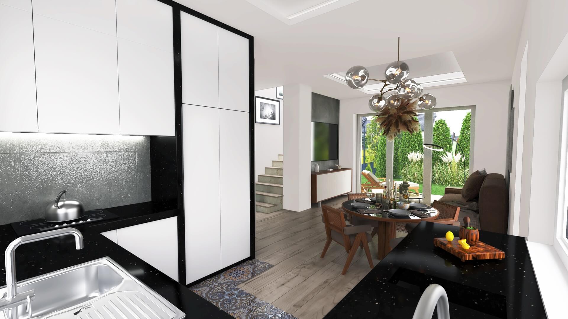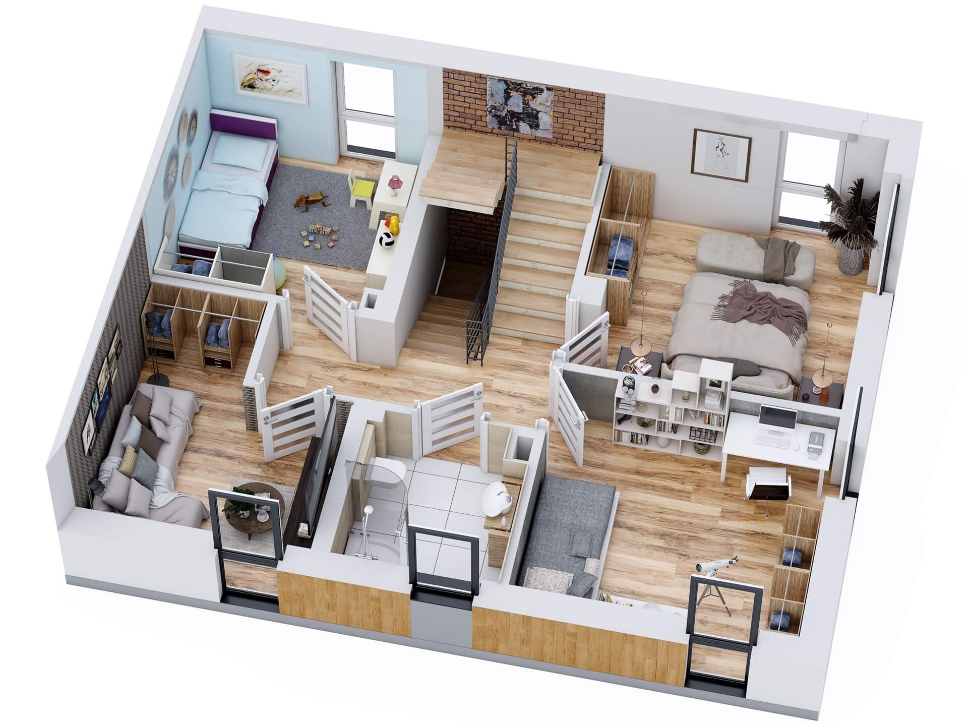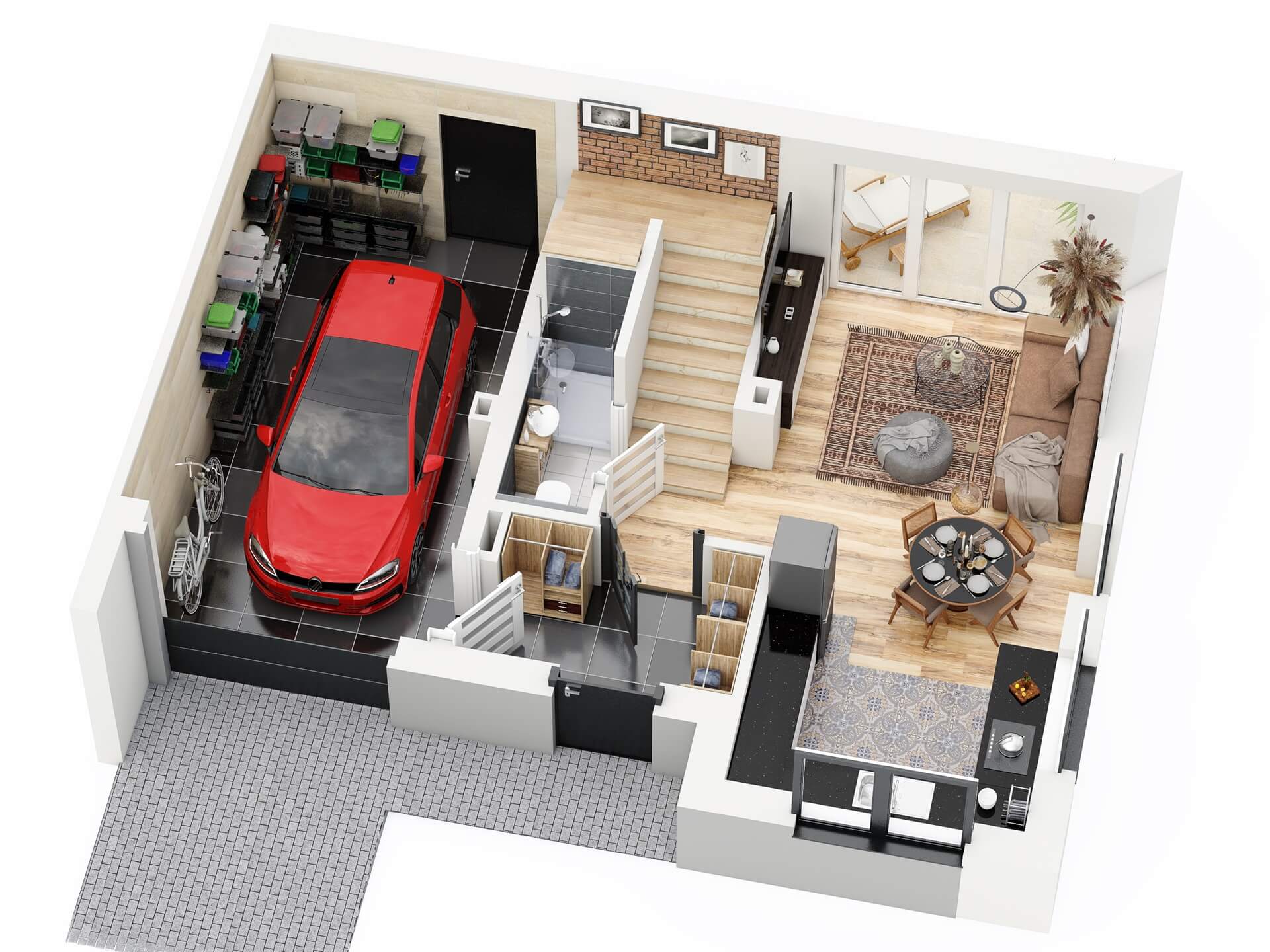 W swoim przyszłym domu będą mieli Państwo do dyspozycji na parterze przestronną kuchnię, salon i gabinet. Dodatkowo na parterze zlokalizowane są: przedsionek z garderobą, pełna toaleta i garaż na dwa samochody. Na piętrze dom będzie posiadał cztery pokoje, dwie łazienki i pomieszczenia do rekreacji. Wszystkie pomieszczenia mozna dowolnie adaptować według swoich potrzeb.